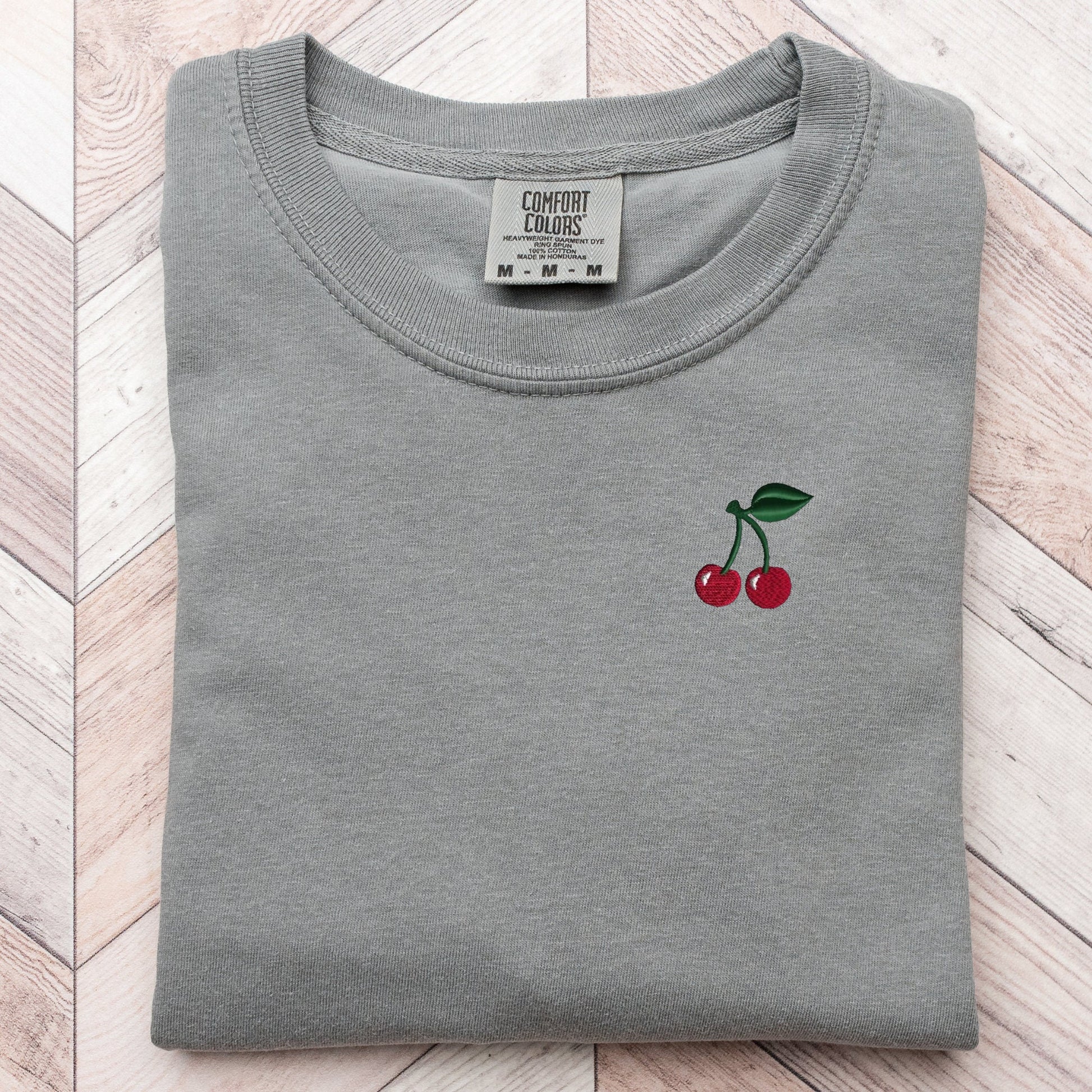 - Exquisite Embroidered Mini Cherry Design: Our garment dyed t-shirt features a meticulously embroidered mini cherry design on the front, showcasing the allure of this juicy fruit. The intricate stitching captures the essence of a fresh cherries, creating a visual centerpiece that is both playful and eye-catching.