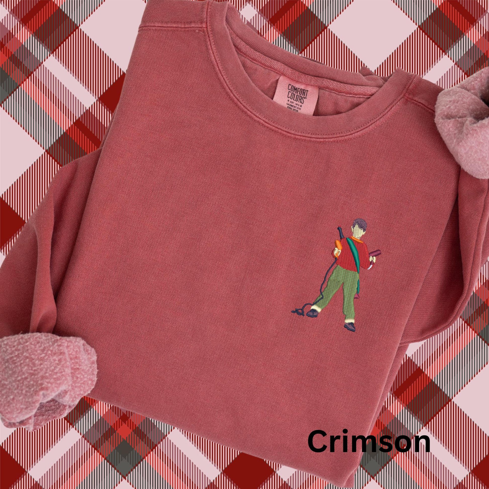 Embroidered Home Alone Movie Pigment Dyed Crewneck Sweatshirt: Minimalist Kevin Christmas Pullover