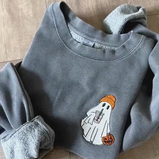 Stay cozy and stylish this Halloween and fall with our exclusive Spooky Ghost Pigment Dyed Crewneck Sweatshirt! This unique sweatshirt features an embroidered design of an adorable ghost wearing a beanie and sipping on an iced coffee, capturing the essence of autumn in the most charming way.