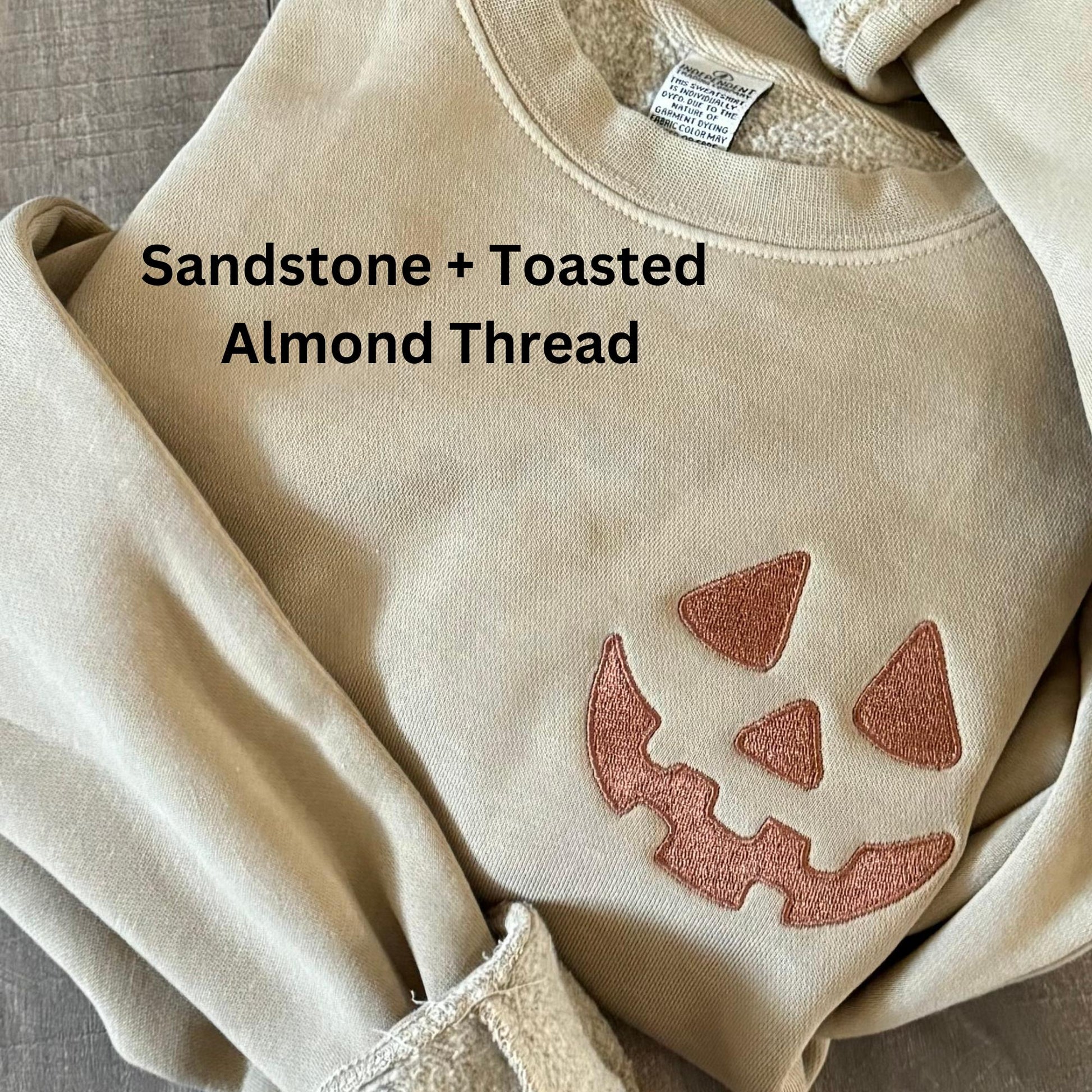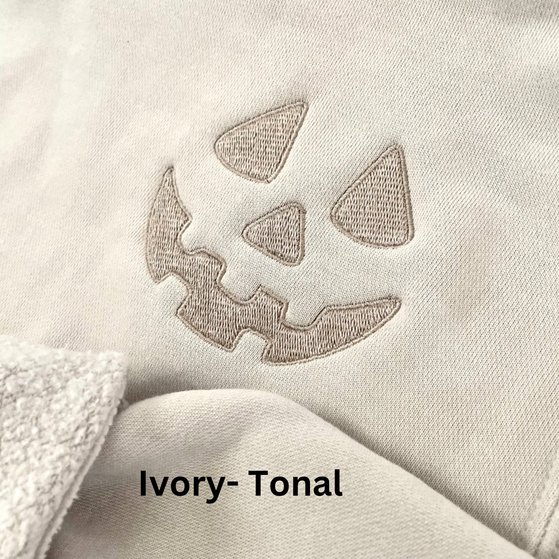 **Please note that due to the pigment dying process, colors will vary. - Tonal Embroidery: The front of the sweatshirt features a meticulously stitched, tonal embroidered design of a classic pumpkin face, adding an extra touch of elegance to your Halloween ensemble.