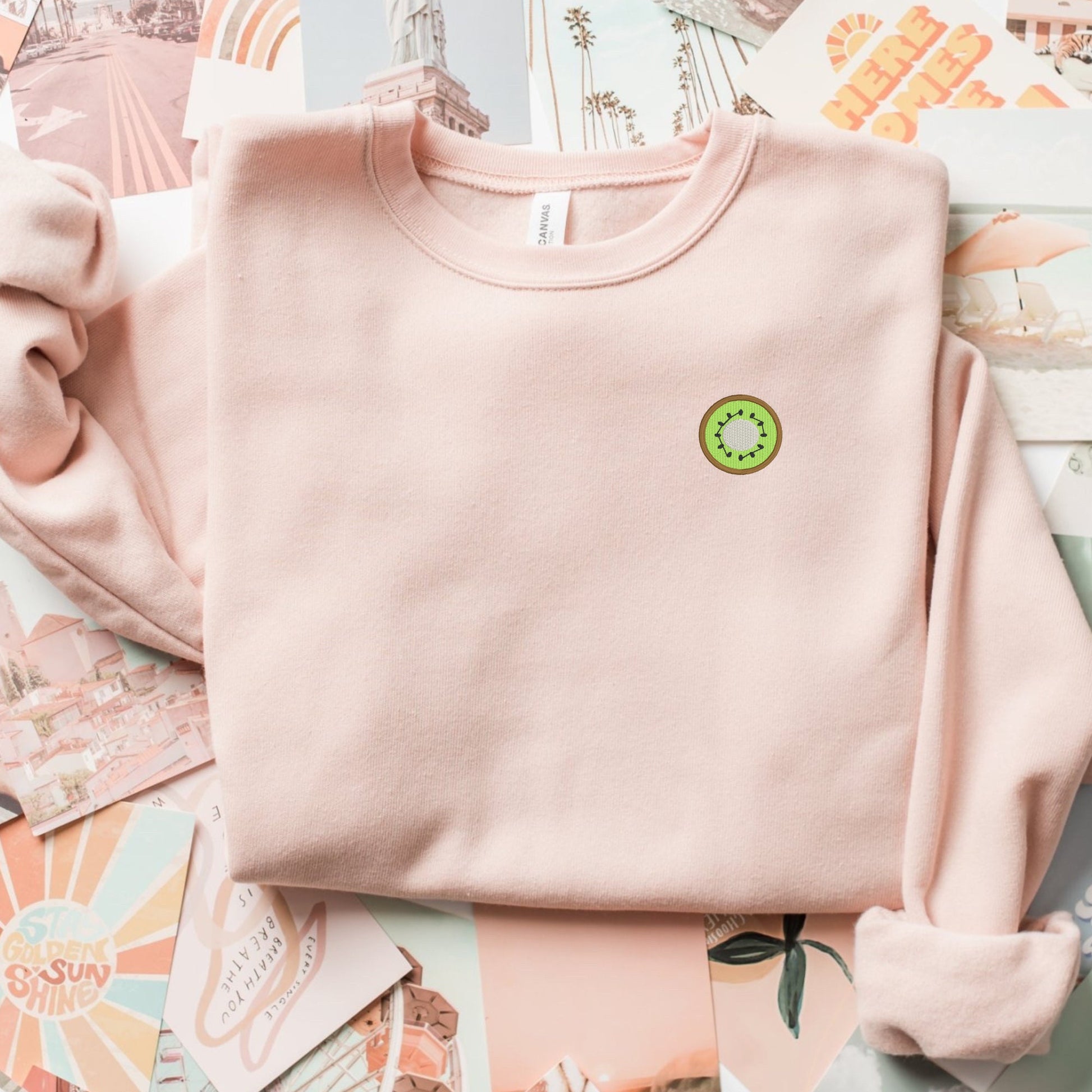 - Vibrant Embroidered Design: Adorned with a playful mini kiwi embroidery, this sweatshirt adds a pop of color and whimsy to your ensemble. The detailed stitching captures the essence of this beloved fruit, making it a fun and eye-catching statement piece.