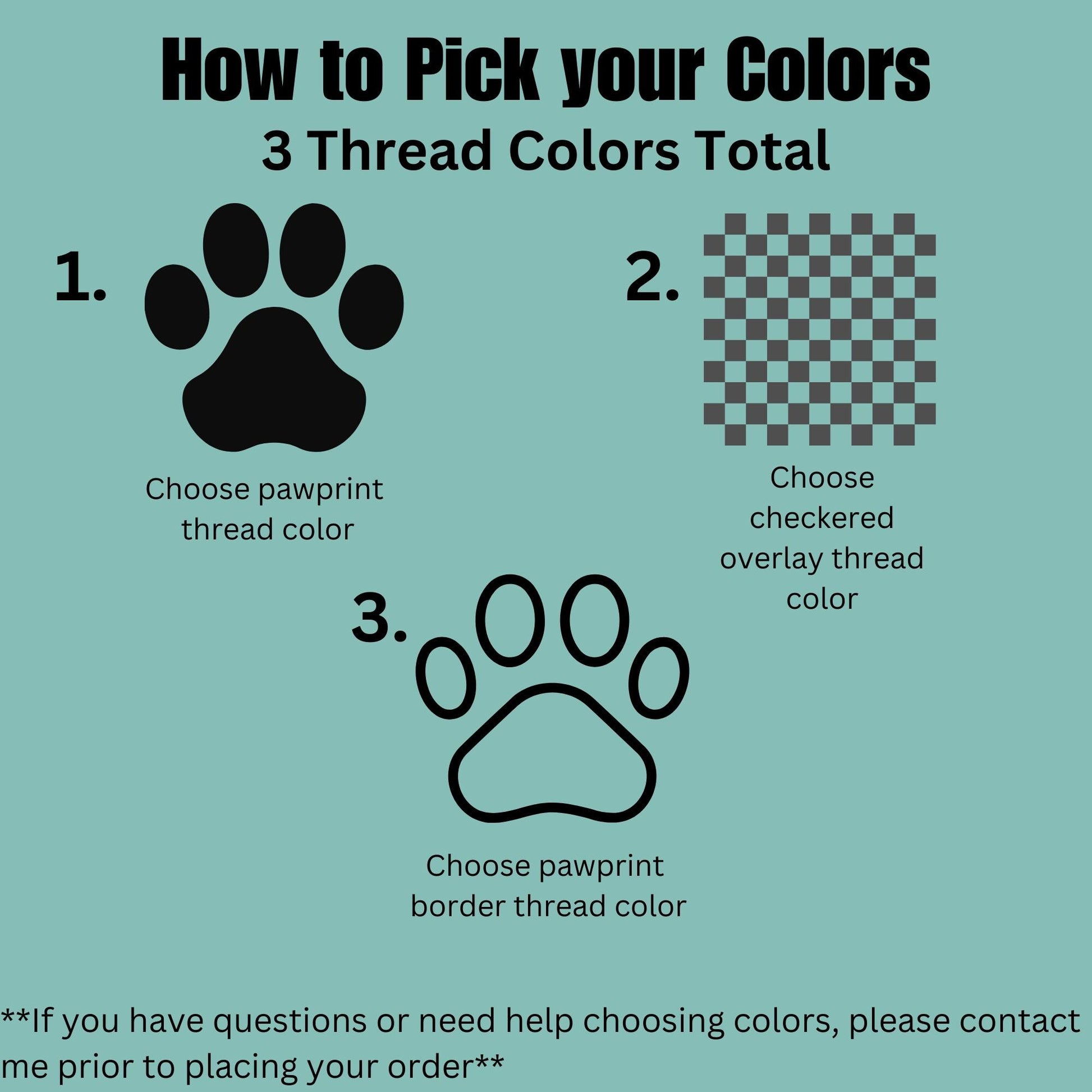 - Use the "Personalization Box" to enter your thread color selections. Thread Color Chart is included in the listing photos. See "How to Pick your Colors" chart within listing photos for more detailed instructions. You will be selecting 3 thread colors: 1.) Pawprint color, 2.) Checkered Overlay Color, and 3.) Pawprint Border Color. Enter your selections into the "Personalization Box" in order by numbering your selections 1, 2, and 3.