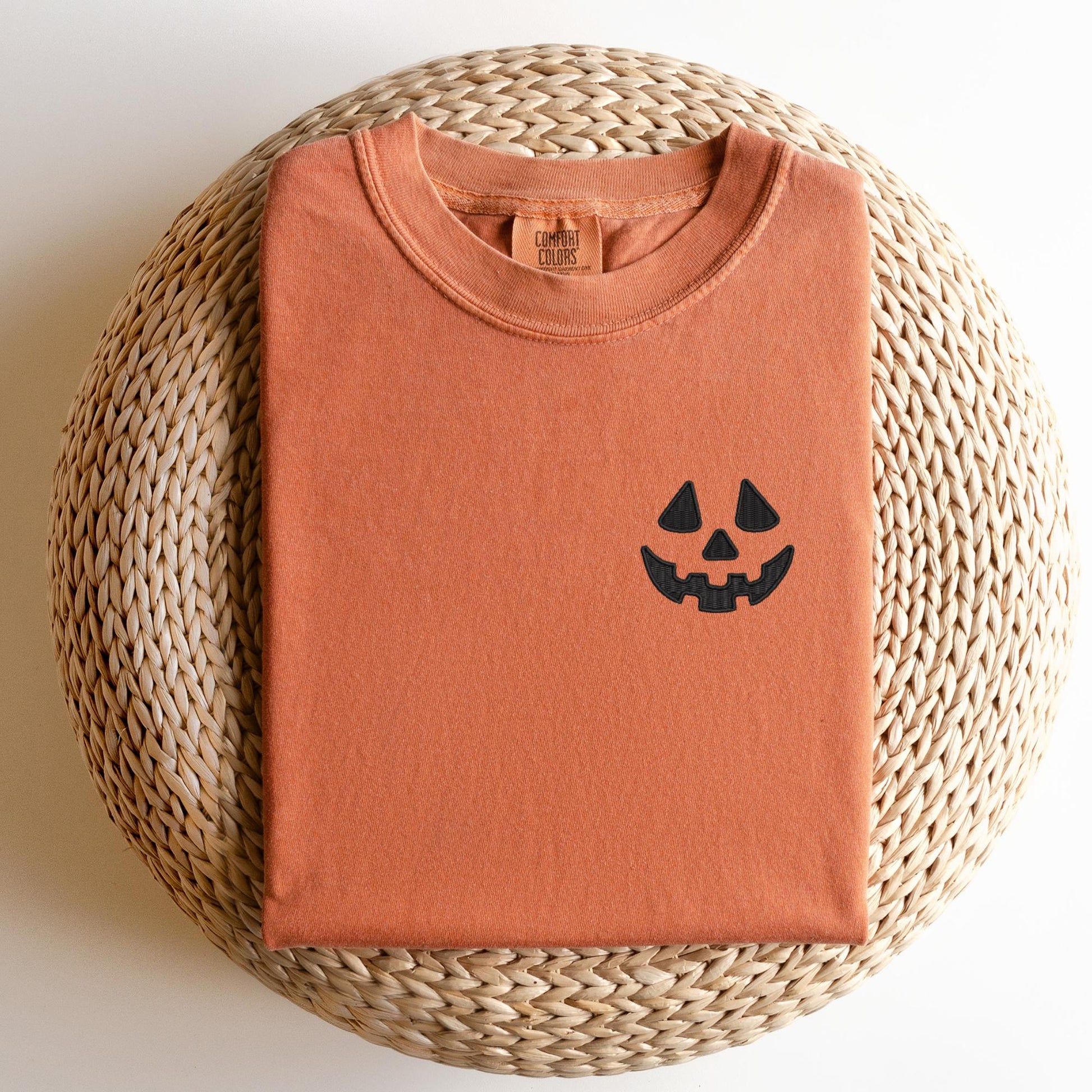 - Keep your Halloween style subtle and sweet with this cozy, high-quality pigment dyed t-shirt featuring a mini embroidered pumpkin face stitched on the left chest. This minimalist design adds a festive fall flair without going over the top—perfect for lovers of clean, understated holiday fashion.