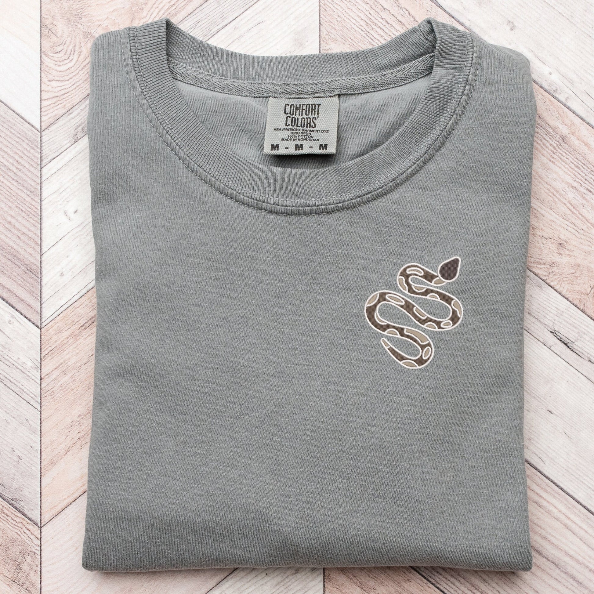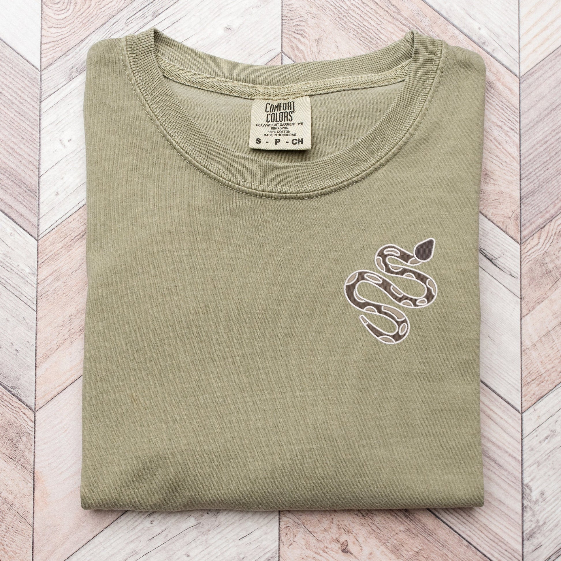 Show off your wild side with this embroidered garment-dyed snake tee — a cozy, vintage-washed shirt made just for reptile enthusiasts and animal lovers alike.