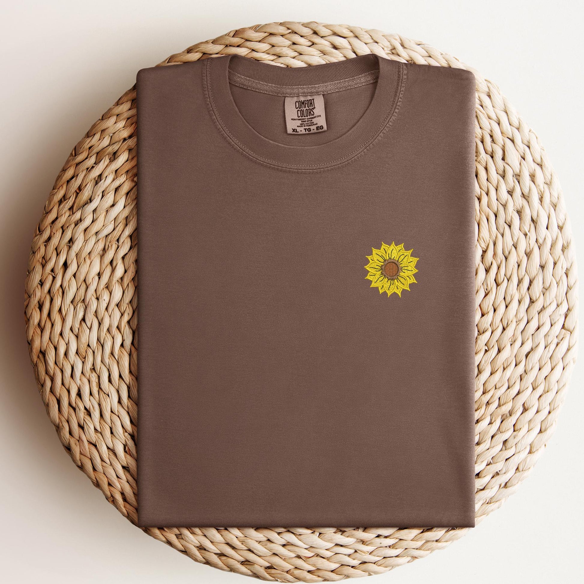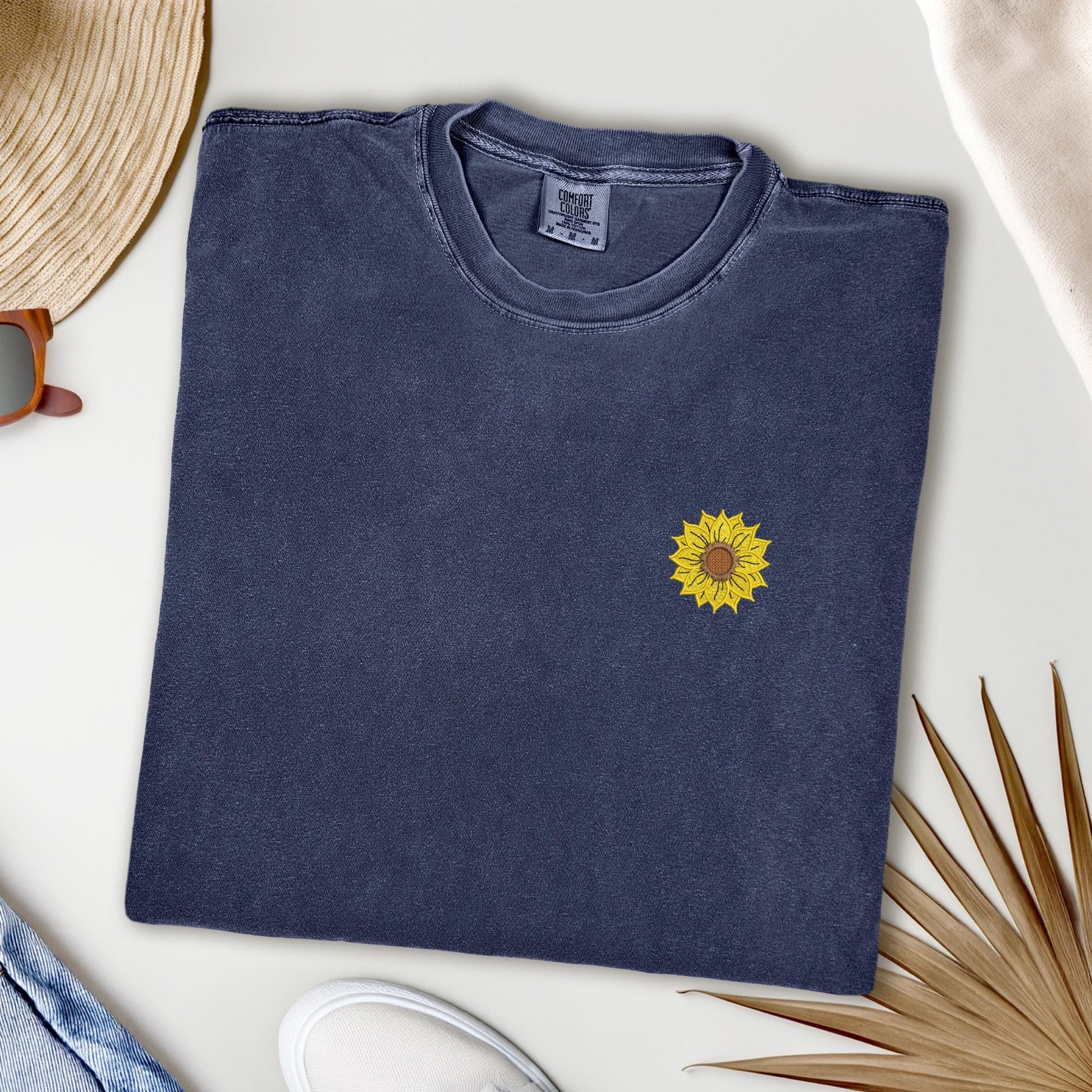 Bring a little sunshine wherever you go with this minimalist embroidered sunflower t-shirt, featuring a tiny stitched sunflower over the left chest. This pigment-dyed tee has that perfectly faded, vintage look and soft, worn-in feel right out of the package