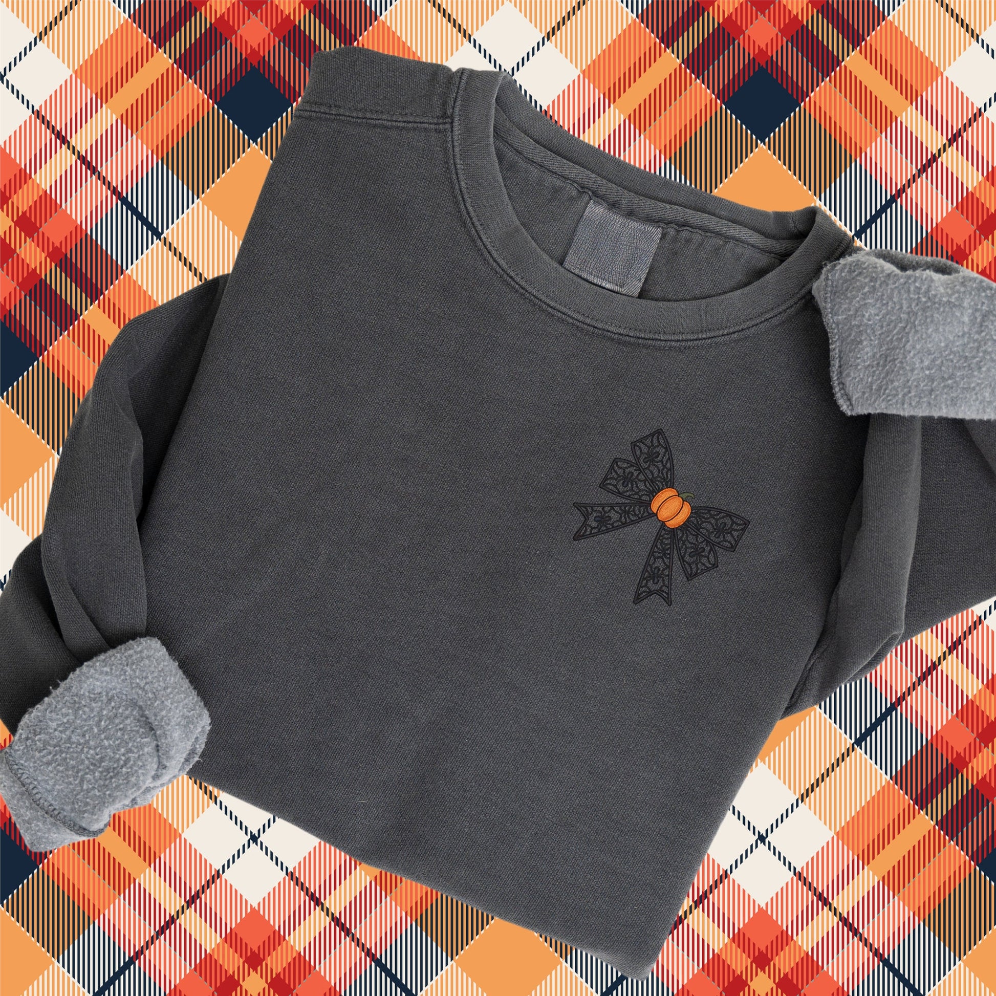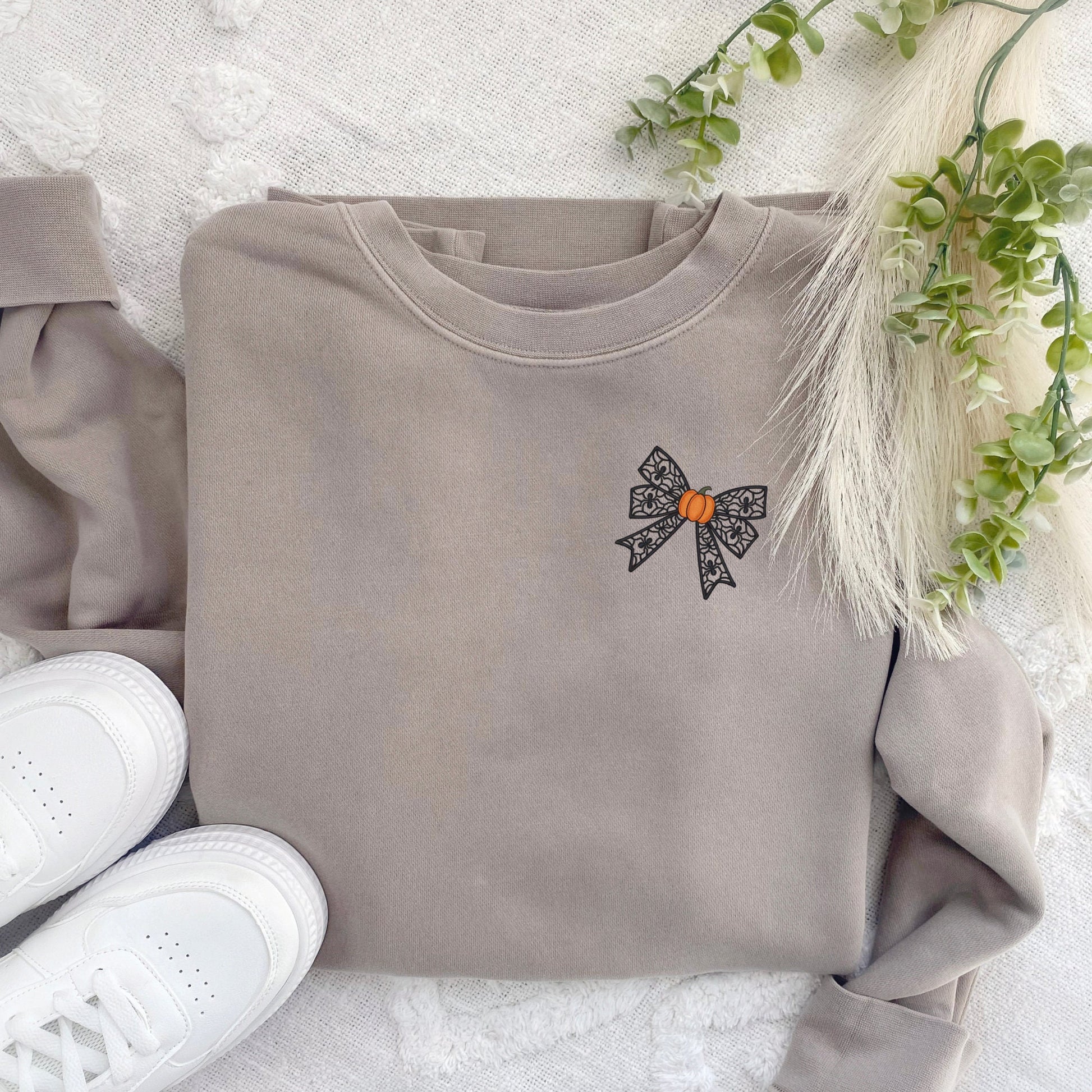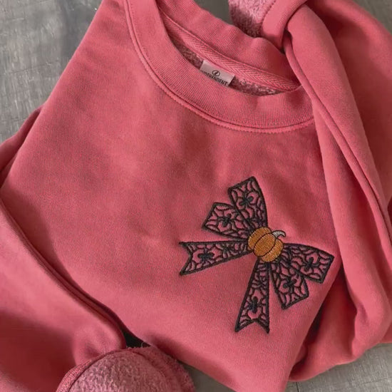 Halloween Coquette Sweatshirt: Embroidered Lacey Spider Bow & Pumpkin - Pigment Dyed